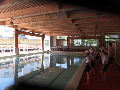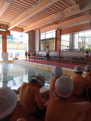 プールびらきの様子です。今季も安全に水泳の授業ができるよう、また、めあてをもって取り組むよう、プールびらきを行います。代表児童は立派にめあてを言うことができました。