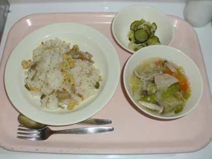 鶏とごぼうのピラフ 牛乳 大豆ときのこのスープ