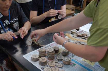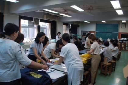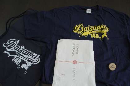 Tシャツのデザイン。ナップザックのデザイン。キーホルダーは一つ一つ紙やすりをかけて作った手作りのものです。全校児童用に袋詰めもしてくださりました。