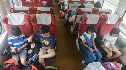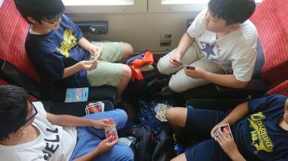 新幹線では、カードゲームなどをして上手に時間を使っています。みんな、楽しそう!