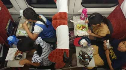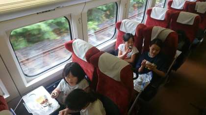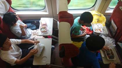 お弁当タイムです。山形新幹線に入り、けっこう揺れる中、いただきまーす!
