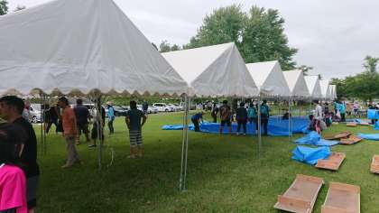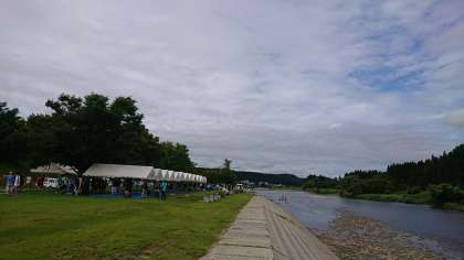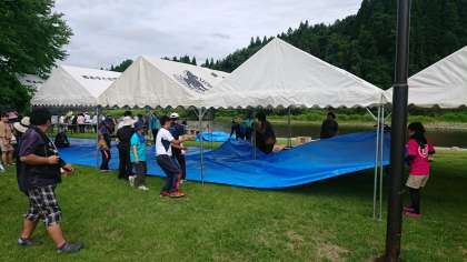 子どもたちが来る前に、河原の準備です。舟形の皆さん総出で、今年は世田谷引率者も加わって、テント張り。天気も良くなってきました!