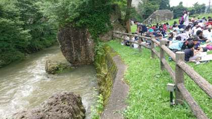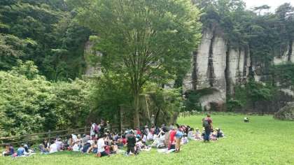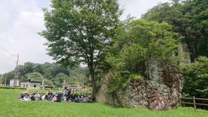 大谷景観公園でお弁当タイム。少ない日陰でみんなよりそいながら、いただきまーす。朝早くからお弁当を作ってくれたお家の方に感謝です。