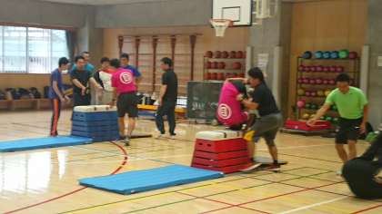今日は多聞小学校に2ブロックの教員が集まって、体育の実技研修を行いました。タブレットを活用したり、いろいろな教具を使ったりして、マットや跳び箱の指導の仕方を学びました。