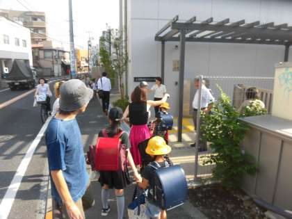 新校舎になって初めての登校日です。期待に満ちた表情や、門に立っている先生に「もう入っていいの?」と尋ねる様子も見られました。