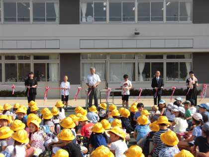 校舎落成に際して、来賓にPTA会長、学校運営委員長、落成・周年委員長をお招きして、6年代表児童、校長と共にテープカットが行われました。