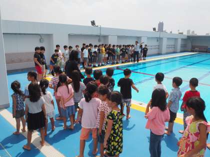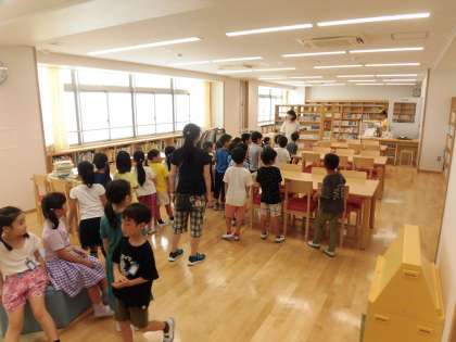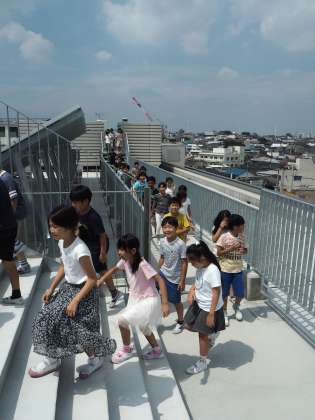 新校舎の施設を見て回ります。「すごい図書室になった!」「プールがきれい!」など、子ども達は驚きを思わず口にしていました。新しい施設の使い方だけではなく、生活上、ケガにつながりそうな危険なところなども併せて指導しています。各ご家庭でも、学校生活を安全に過ごすために話題にしていただければと思います。