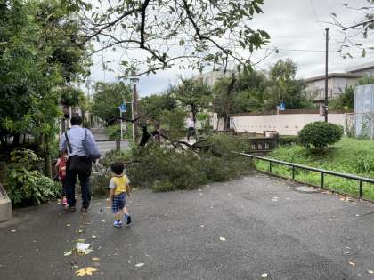 せせらぎ公園のところで木の枝が折れています。脇は通れるようですが、気をつけてください。