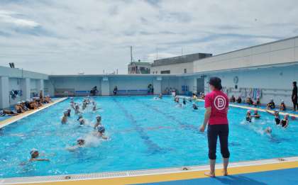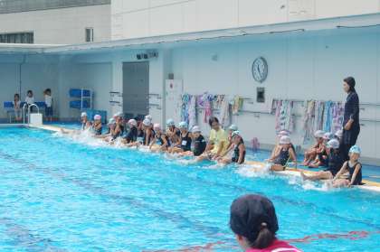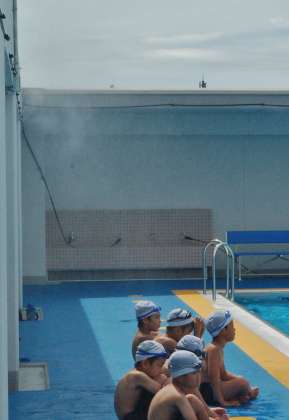 台風一過の真夏日、1年生は屋上プールで体育の学習でした。屋上プールには、ミストが出るようになっています。今日のような暑い日には最高です。1年生の歓声が屋上プールに響いていました。