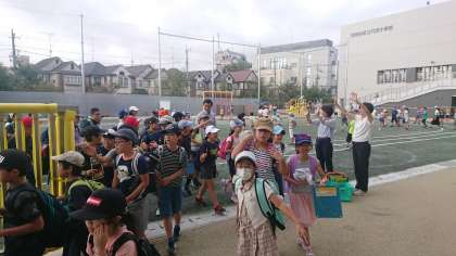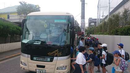 今日は4年生の社会科見学です。元気よく出発です。新校舎で最初のバス活用です。