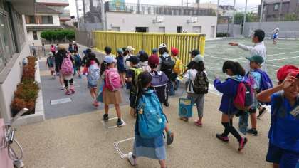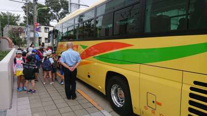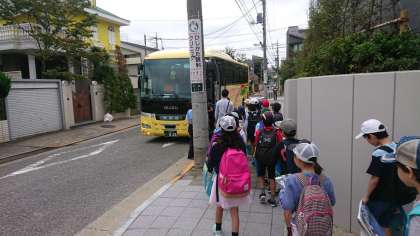 今日は4年生の教育センター移動教室です。教育センターで、英語体験とプラネタリウム見学をします。はりきっていきましょう。