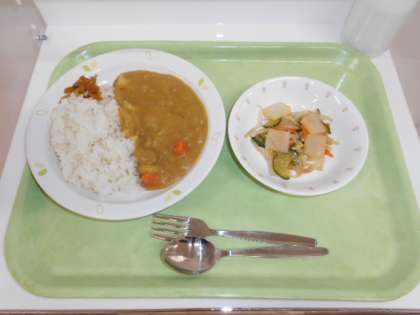 カレーライス 牛乳 福神漬け こんにゃくサラダ