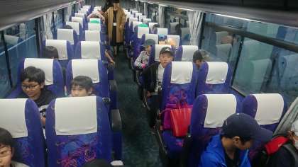 交流タイムも終わり、各家庭へ引き取りです。代沢に戻る子達は、バスに乗り込みました。