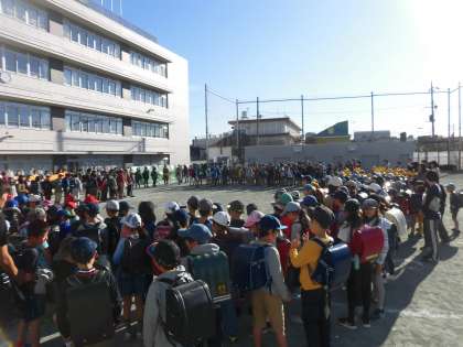 本日は舟形交流として、舟形小学校・山崎小学校・代沢小学校の3校で浅草への遠足です。その見送りを登校してきている児童で行いました。代表の言葉のあと、みんなで元気に「いってきます」「いってらっしゃい」で出発です。