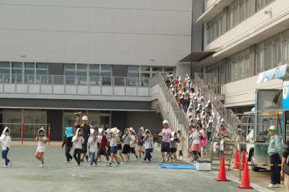 本日避難訓練を実施しました。また、起震車で地震体験も行われました。