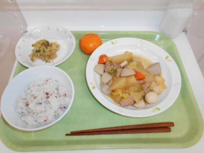 梅じゃこごはん 牛乳 豚肉と大根のうま煮