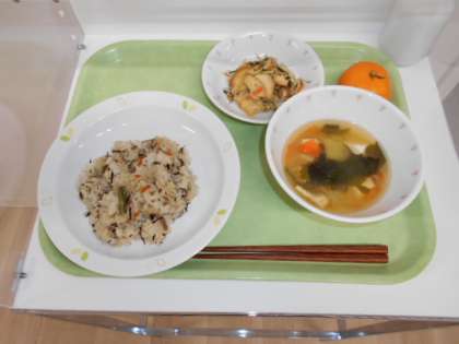 磯おこわ 牛乳 フーイリチー みそ汁 くだもの