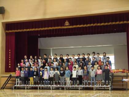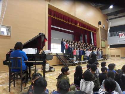 とても元気のよい、素晴らしい歌声でした。発表後も児童退場の際、全ての児童が体育館から退場するまで再びこの歌を歌い続けてくれました。
