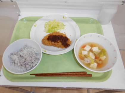 ゆかりごはん 牛乳 ひれかつ ゆでキャベツ 豆腐汁