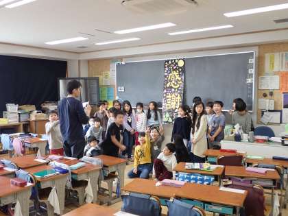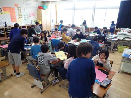 中学年の様子です。6年生に向けての出し物の準備や、せせらぎ班(縦割り班)の寄せ書きを作っていました。