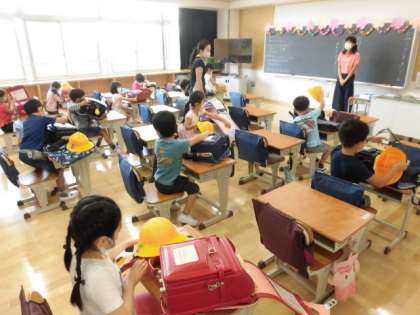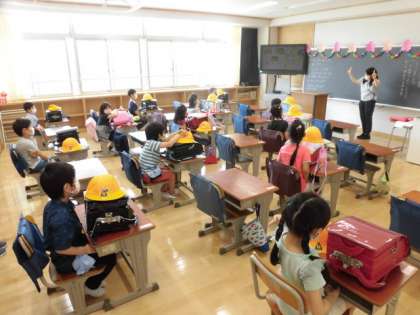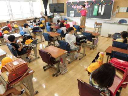 はじめて自分の教室に入った1年生。自分の席の場所に座って、防災ずきんを椅子に掛けて、名札をして先生の話を聞いています。学校に来て教室に入ったらすることを一つ一つ確認しています。