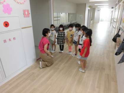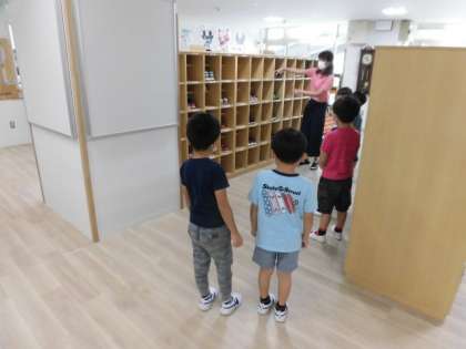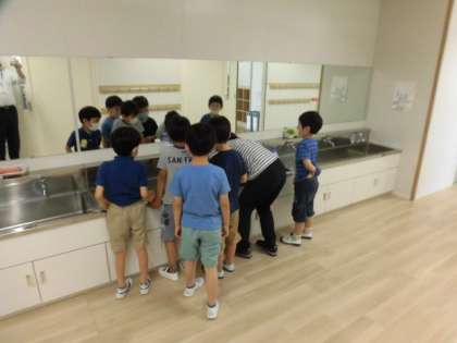 靴箱やトイレ、水道など、多くの人がい一緒に使うところの使い方について先生から話を聞いています。みんな静かにお話が聞けています。1年Aグループの子どもたちは、昨日同じ内容のお勉強をしました。覚えているかお家で聞いてみてください。