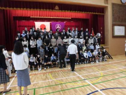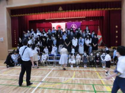 入学式終了後は、記念写真です。上手に並ぶことができました。マスクも自分で取って、いい笑顔での記念撮影です。