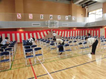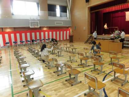 1・2組の入学式が終わった体育館では、先生方、主事さん方が児童椅子、保護者椅子の消毒をして、午後の入学式の準備をしてくれています。3・4組の入学式もみんなでよい式にしていきましょう。