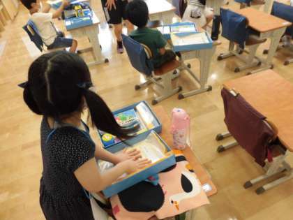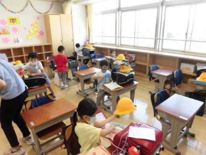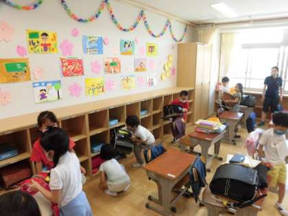 登校後の1年生の教室です。ランドセルに入っていたものを出して、ランドセルを教室の後ろの棚に黄色い帽子と一緒にしまいます。今日持ってきたお道具箱も整理して机の中にしまました。とても上手に準備ができています。