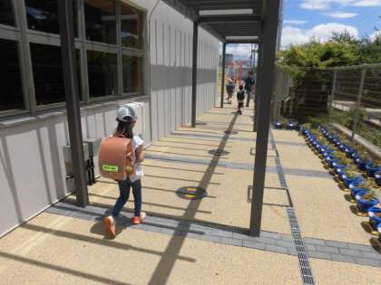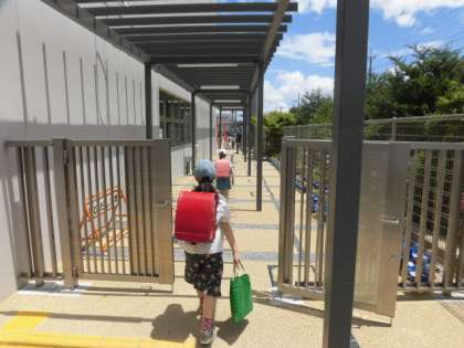 午後の部の2・5年生の子どもたちが登校してきました。天気はよいですが、風が強いです。健康観察表や帽子が飛ばされないように押さえて登校してきています。午後も3時間頑張りましょう。