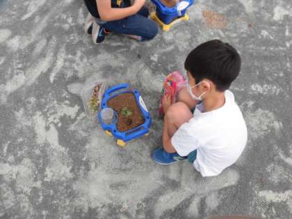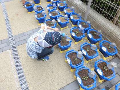2年生は、生活科でオクラを育てます。今日ははちに土を入れて苗を植えて、最期にたっぷりとお水をあげました。早く大きくなるようしっかりと世話をしていきましょう。