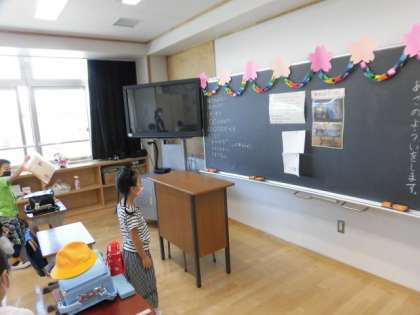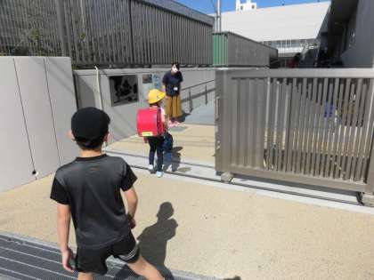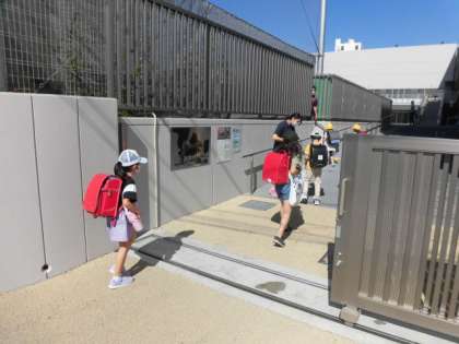 良い天気の中、1年のBグループ、3・4年のAグループの子どもたちが登校してきました。教室に入った1年生の中には、黒板に書かれた今日の予定を確認している子どももいます。名札も自分で上手につけています。