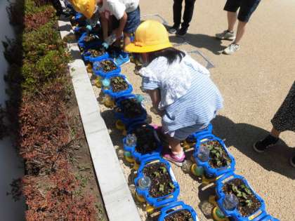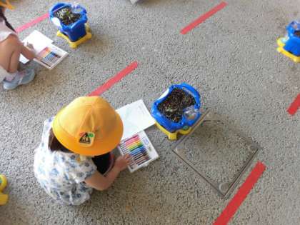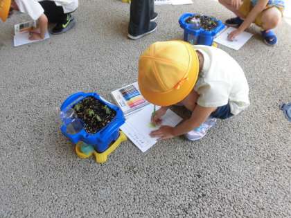 先週、1年生がまいたアサガオが芽をだしました。立派な双葉をみんなで観察してカードに絵をかいて色をぬりました。観察した後は、自分で水をあげました。これから、観察と水やりをしっかりとしていきましょう。