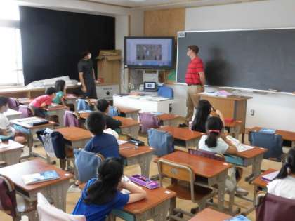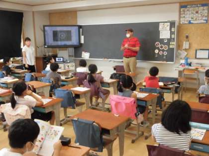 3年生の外国語活動です。担任の先生とALTの先生と一緒に、いろいろな国の「あいさつ」について勉強しています。
