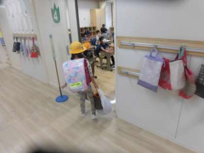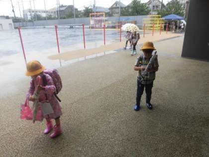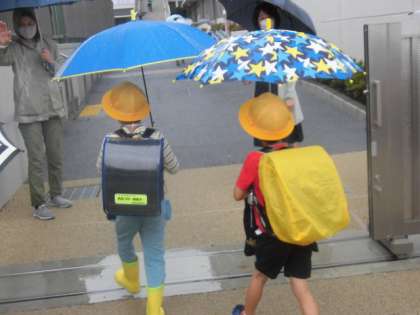 分散登校最終日は、雨の中の登校になりました。傘を差して登校した1年生。玄関でレインコートを脱いだり、傘を丸めて傘立てに入れたりするのも落ち着いて行いました。これまでと違った登校ですが、教室に入ればしっかりと朝の支度をしています。今日も頑張りましょう。