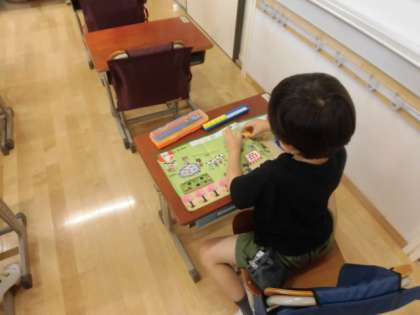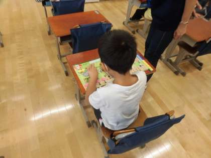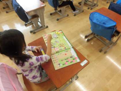 1年生の算数の授業です。教科書に書かれている絵を確認しながら、その数だけ、ブロックを丁寧に並べています。