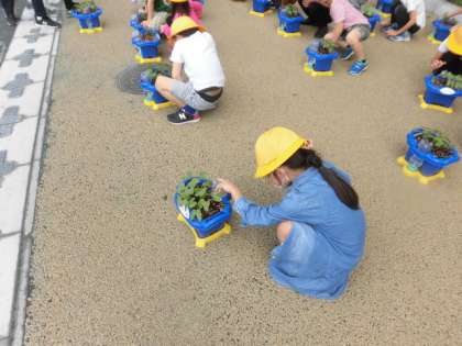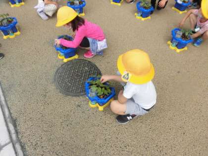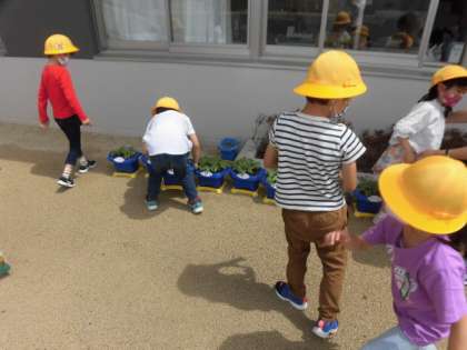 1年生が大切に育てているアサガオ。ずいぶん葉っぱが増えました。葉っぱに触ったり、数を数えたりしています。ひろがって観察して、そのあと、元の場所に戻しました。観察の後は、しっかりと手洗いをして教室に戻りました。明日もお世話をしっかりとしましょう。