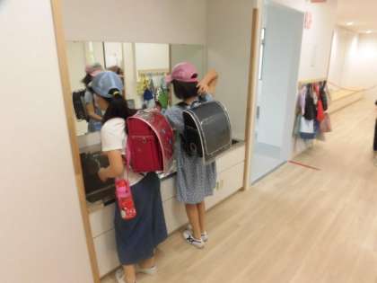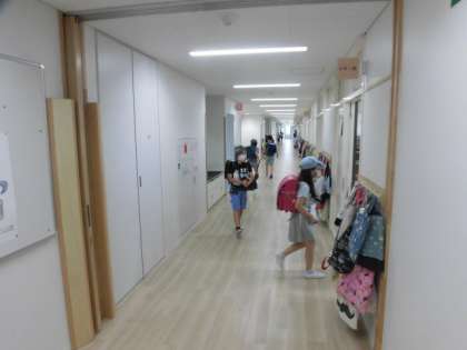 今日の登校時間には、雨が強く降っていました。いつもは校庭で手を洗いますが、今日は、室内に入ってから廊下の水道で手を洗って教室に入るようにしました。みんな、しっかりと手を洗って教室に入っていきます。子どもたちが密にならないように協力しながらの生活です。