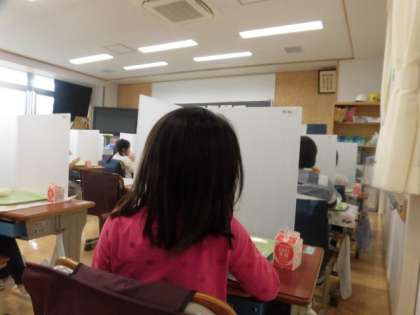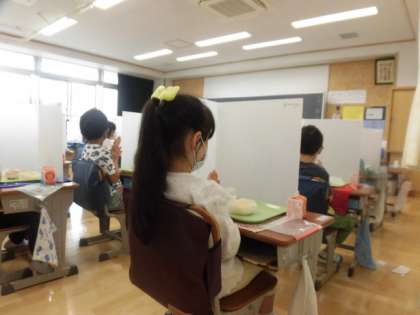 給食も4日め、子どもたちの準備も先生方の配膳も早くなってきました。来週からは、子どもも当番で配膳をします。パーテーションをしての給食。とても静かに食べています。