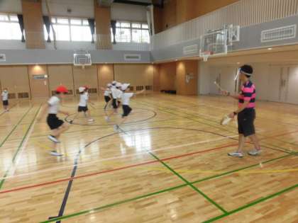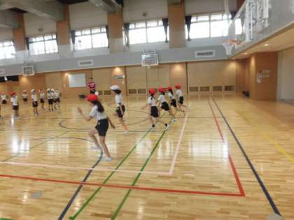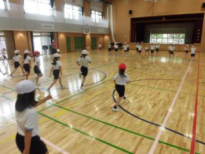 2年1組が体育館で体育の授業をしています。先生の太鼓に合わせてリズムを変えてスキップを行っています。