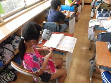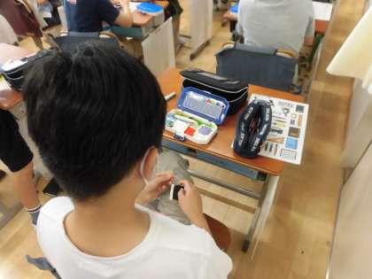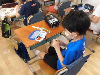 5年2組の子どもたちが真剣に手元を見て真剣に取り組んでいます。何をしているかというと、家庭科の「玉結び」の練習です。最初はなかなな上手にできませんでしたが、何回も挑戦してだんだんとできるようになってきました。裁縫の基本になります。家でもできるか見たあげてください。1組は、昨日、取り組みました。