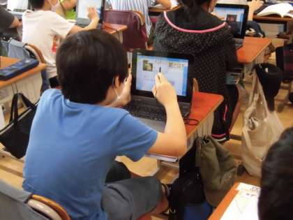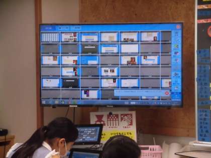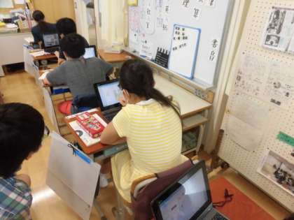 6年1組の教室では、タブレットを使って、教科「日本語」で調べて能や歌舞伎などの日本の伝統文化についてまとめの作品を作っています。インターネットを使って見つけた写真を張り付けたり、説明の文章を入力したりしています。みんな真剣に取り組んでいます。