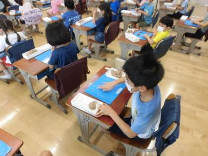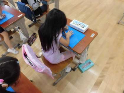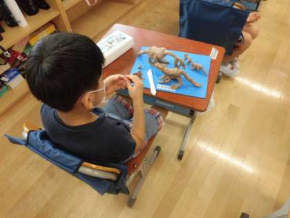 1年4組の子どもたちが図工をしています。今日は、粘土です。大きな塊から粘土を取って、丸めたり、平らにしたりして柔らかくしてから好きなものを作りました。いろいろなものを作って見せてくれました。終わった後は、しっかりと手洗いもしていました。