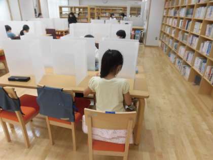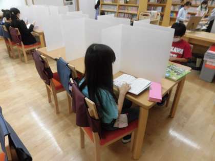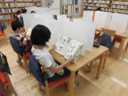 4年1組の図書の時間です。並んで本を借りたら、パーテーションで区切られた机で、静かに本を読んでいます。本を探す時も読むときもおしゃべりが聞こえません。