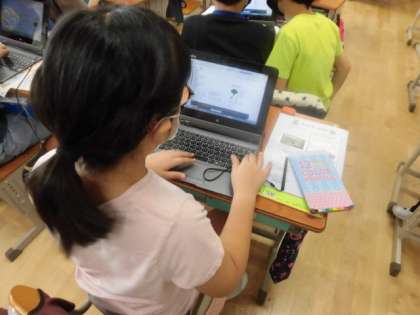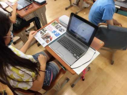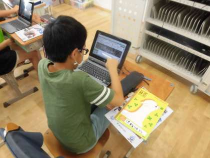 4年3組もタブレットを使っての授業です。社会の「水はどこから」の学習で、インターネットを使った調べ学習をしています。めあてのホームページが開けると喜んで報告してくれます。