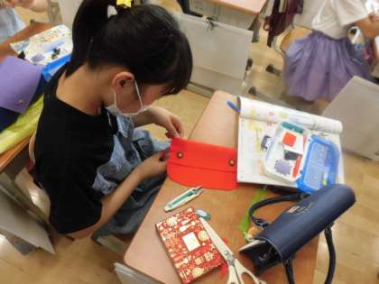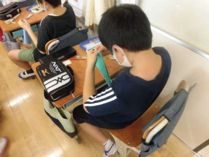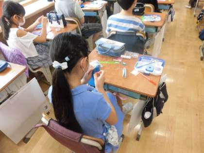 5年1組では、家庭科でボタン付けをしています。たま止め、たま結びも上手になり、今回はボタン付けに挑戦です。みんな真剣に取り組んでいます。