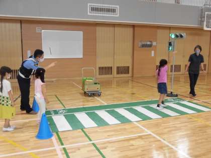 信号を渡る前には信号機の色を確認し、「右・左・もう一度右」の安全確認をして、手をしっかりと挙げて渡ります。「止まれ」の標識の前でも左右の安全確認をして、路側帯からはみ出さないように歩きます。
