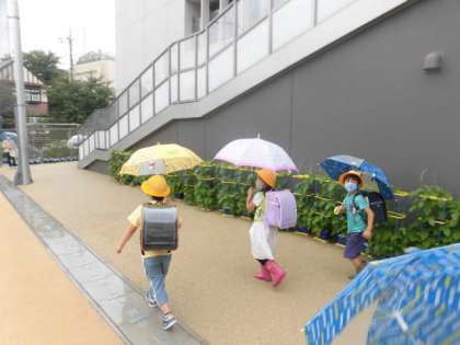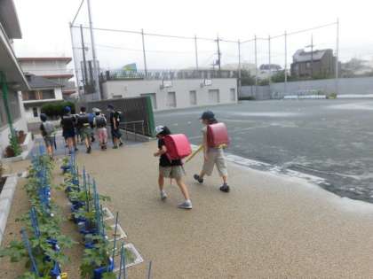1・2年生は、5時間、3年生から6年生は6時間の授業を終えて下校です。今日は1日雨でした。とても強い雨も降りましたが、帰りは小降りになっていてよかったです。明日の「スポーツの日」も授業があります。離任式もありますから、明日も元気に登校してきてくださいね。