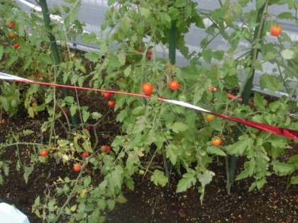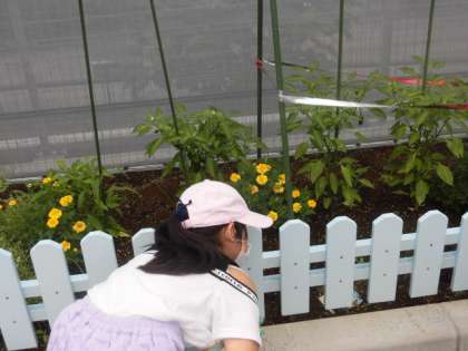 2年生が花壇で育てている「ミニトマト」「ピーマン」「ナス」。今年は雨の日が多く、日照時間も少なく育つか心配でしたが、それぞれ実をつけ始めました。2年生が観察をしています。