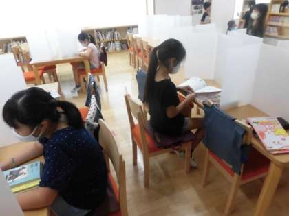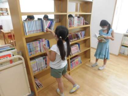 4年3組の図書の時間です。夏休み用の本も借りています。夏休みも読書楽しみましょう。今年の夏休みの図書室の開放は、すでに通知でお知らせしましたが、8月3日(月)〜7日(金)、24日(月)〜28日(金)の13時から15時です。本の貸し出しのみで、図書室での読書はできません。また、入室の人数を制限させていただく場合もあります。図書室に来た時は、すべての学年が1階の昇降口から入って、外履きをもって図書室に行ってください。ご協力をお願いします。